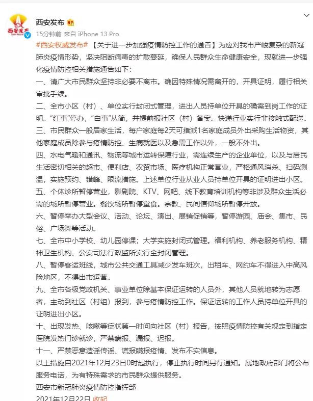 以上措施自2021年12月23日0时起执行,停止执行时间另行通知。属地政府部门将公布服务电话,为有特殊需求的市民群众提供服务。