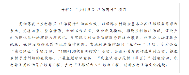 (三)均衡配置城乡法律服务资源。围绕服务乡村振兴战略,按照产业兴旺、生态宜居、乡风文明、治理有效、生活富裕的乡村振兴战略总要求,深入实施“乡村振兴 法治同行”专项活动,深化法治乡村(社区)建设,深入开展“民主法治示范村(社区)”创建,加强动态管理。推进实施乡村“法律明白人”培养工程和农村学法用法示范户培育工程,教育引导农村广大干部群众办事依法、遇事找法、解决问题用法、化解矛盾靠法。依法有效拓展城镇法律服务资源向农村地区辐射的方式和途径,创新便民利民服务形式。