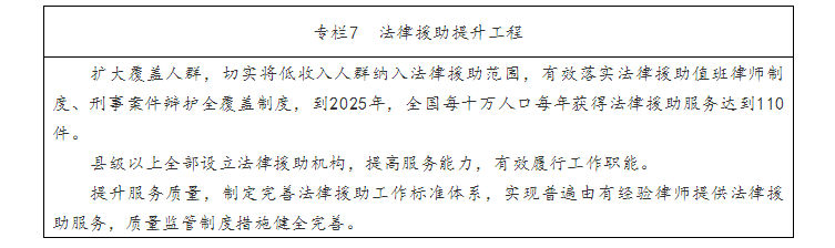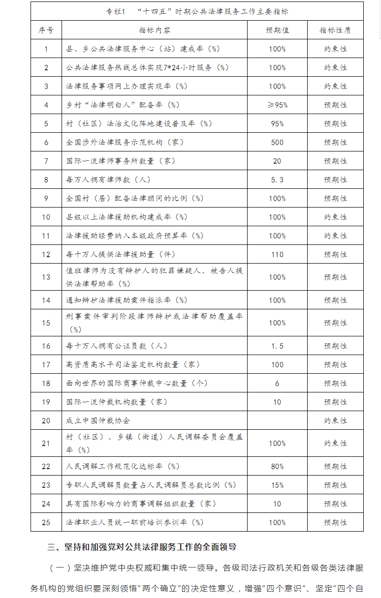 ——发挥律师在公共法律服务中的主力军作用。到2025年,全国执业律师达到75万名。律师行业服务经济社会发展、履行公共法律服务职能的体制机制进一步健全完善。律师调解、村(居)法律顾问工作进一步加强和规范,服务领域不断扩展,服务能力不断提升,服务质效不断增强。律师队伍社会责任感进一步增强,参与公益法律服务实现规范化、制度化、常态化。