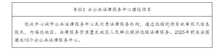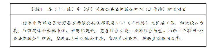 (四)加强欠发达地区公共法律服务建设。结合革命老区、民族地区、边疆地区、脱贫地区实际,制定支持公共法律服务体系建设方案举措。进一步完善、落实支持西藏和四省藏区公共法律服务建设方案。健全完善中西部边远地区法律援助机构设置,支持法治宣传阵地建设。加强对中央财政转移支付资金用于欠发达地区、边疆地区公共法律服务基础设施建设和人才培训等的监管。支持东部经济发达地区和中西部经济欠发达地区建立多种形式对接机制,开展对口援建、挂职锻炼、交流培训。通过选派志愿律师到无律师县、鼓励支持其他地区律师事务所与无律师县结对帮扶等方式,确保法律服务县域全覆盖。加强无律师县国资律师事务所建设,鼓励、支持外地律师事务所在无律师县设立分所,全国无律师县问题基本解决。立足基层法律服务工作者贴近基层和群众的特征和优势,因地制宜发展基层法律服务工作者队伍,有效补充律师资源不足地区的法律服务力量。加强公证服务资源布局规划、动态调配,统筹解决“无人处”“一人处”导致公证机构不能正常执业、公证服务缺失等问题。实施“云公共法律服务中心”建设项目,运用网络服务、远程视频服务模式,促进优质资源向欠发达地区辐射。推进“1 1”中国法律援助志愿者行动、“援藏律师服务团”、“同心·律师服务团”等志愿服务活动。