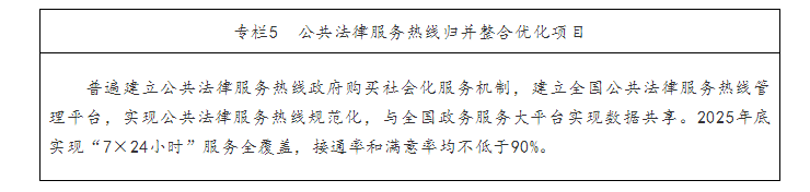 (七)推动公共法律服务热线、网络平台优化升级。落实国务院统一部署,推动“12348”公共法律服务热线与“12345”政务服务热线归并整合,建立完善转接机制,优化座席设置,按照统一标准提供“7×24小时”服务。加强热线答问标准化知识库建设,提高应答标准化、一致性,强化回访评价、数据归集和分析。加强法律服务网建设,持续推进“互联网 公共法律服务”,建立统一用户认证、统一服务流程、统一受理指派、业务协同办理、服务全程监督、质效科学评价、智能大数据分析研判的公共法律服务网络平台。提升用户体验,提高自助下单、智能文本客服、智能语音等智能化应用水平,提高在线咨询服务质量和效率。强化信息查询功能,提供及时、高效、权威的全面依法治国和司法行政法律法规规范性文件查询、法律服务机构人员数据信息查询、参照案例查询、司法行政和公共法律服务办事指引服务。完善法律服务网在线办事功能,实现“一网通办”。
