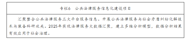 (二十三)加强公共法律服务大数据应用分析。推进各级各类公共法律服务机构、服务平台业务数据整合,建立完善数据分析模型,增强大数据挖掘和分析能力,实现对各类风险矛盾的敏锐感知和精确预测。健全平安中国建设社会协同机制,加强与人民法院、公安、民政等部门衔接联动,加大信息共享,切实为党委政府科学决策、有效防控和化解社会风险发挥积极作用。