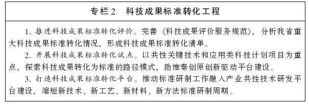 (二)加快科技创新成果向标准转化。充分发挥秦创原创新驱动平台作用,推动科技成果加速向标准转化。推进创新成果转化为标准的技术路径和共性方法研究。完善科技成果转化为标准的服务体系,探索技术经理人、科技成果评价、技术转移转化等领域标准化工作,促进科技成果快速转化应用。