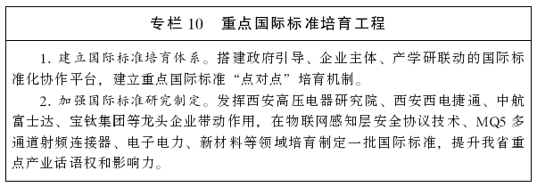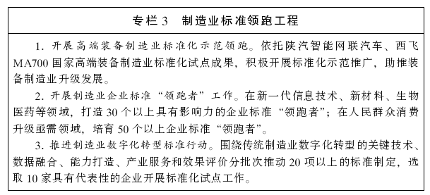 (四)强化先进制造业标准支撑。推进智能制造、服务型制造等标准实施应用,推动绿色制造体系建设与评价。聚焦23条重点产业链,开展全产业链标准图谱研究,加快关键环节、关键领域、关键产品的标准创新和产业化推广示范。支持参与关键基础材料、核心基础零部件(元器件)、先进基础工艺和产业技术基础等标准建设。推进制造业标准化试点示范,提升陕西制造产品质量和品牌形象。