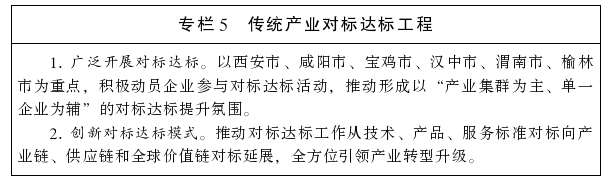 (六)推动传统产业标准升级。结合传统产业转型升级改造专项行动,加快新技术、新工艺、新设备、新材料、新模式相关标准实施应用。开展企业标准对标达标专项提升行动,推动食品加工、石油(煤炭)化工、冶金钢铁、建筑建材、纺织服装等传统产业对标国际先进标准提高产品服务水平。