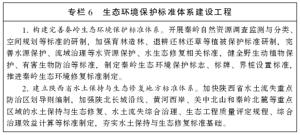 (十)完善秦岭、黄河等生态环境保护标准体系。围绕大熊猫国家公园(陕西片区)、秦岭国家公园建设,开展森林植被保护和恢复、水环境和水资源以及水生态保护、珍稀濒危物种栖息地保护和恢复、秦岭生态环境保护设施等标准研制,探索与相邻省份标准比对评估。围绕黄河流域生态保护和高质量发展,健全黄土高原塬面保护、拦沙工程、新型淤地坝建设、坡耕地综合整治、小流域综合治理、河湖治理与水沙调控等标准。围绕打好蓝天、碧水、净土保卫战,完善主要污染物排放、监督管理、污染防治与环境修复相关标准,持续改善生态环境质量。