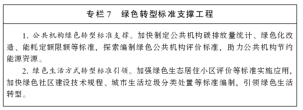 (十二)加强绿色生活标准推广普及。强化与民生密切相关的绿色产品标准应用推广,引导消费者购买节能环保低碳产品。加快绿色采购、垃圾分类、制止餐饮浪费、绿色出行、节能节水等绿色生活标准推广,倡导简约适度、绿色低碳的生活方式。探索绿色公共机构评价标准,合理制定消耗定额和垃圾排放指标。
