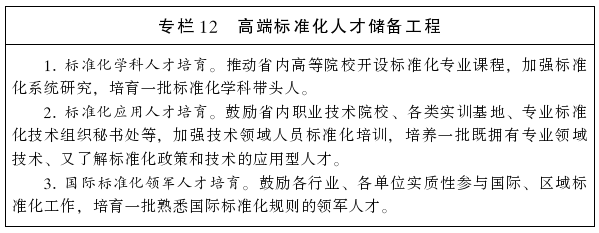 (三十)壮大标准化专业人才队伍。推动标准化纳入省内普通高等教育、职业教育和继续教育体系。构建多层次从业人员培养培训体系,完善标准化专家库。开展标准化专业人才培养培训,造就一支熟练掌握国际规则、精通专业技术的职业化高端人才队伍。加强基层标准化管理人员队伍建设。